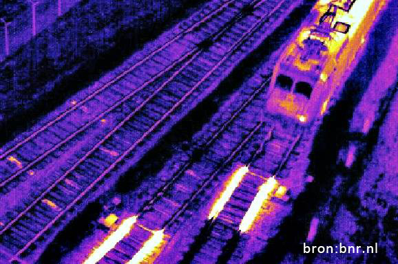 ''ProRail heeft bekendgemaakt gebruik te maken van drones, onbemande helikopters, om tijdens het huidige winterse weer de wissels op het spoor in de gaten te houden. Via de infraroodcamera's van de drones is te zien of de wissels zijn bevroren en of er ingegrepen moet worden. Dat schrijftTweakers.net. Volgens de spoorbeheerder gaat het vooralsnog om een test die nog niet is afgerond. Eerste tests zouden goed zijn verlopen. Er zou gemakkelijk gecontroleerd kunnen worden of de wisselverwarming nog werkt of niet, aldus ProRail.veilige oplossing